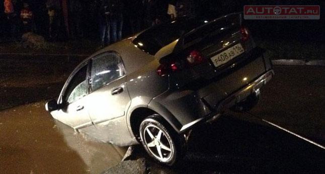 Вчера вечером на улице Курчатова в глубокую яму прямо во время движения провалился автомобиль Chevrolet Lacetti. По словам владельца иномарки, он возвращался домой по привычному маршруту, когда неожиданно асфальт просел под тяжестью машины и перед «Лачетти» оказался в ловушке.