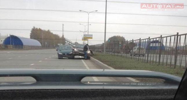 На видео видно, как поток машин движется по Мамадышскому тракту. В какой-то момент автомобиль Peugeot, двигавшийся по крайней правой полосе, ударяется о бордюр и неожиданно начинает перестраиваться в крайнюю левую полосу. Как итог, в него влетает Hyundai.
