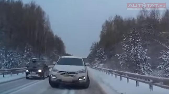 Обратите внимание, что дорога покрыта снегом и, вероятнее всего, льдом. Удивительно, но водитель корейского внедорожника видимо решил понадеется на мощность своего мотора, а не на здравый смысл и пошел на обгон. Как итог, почти лобовое столкновение.