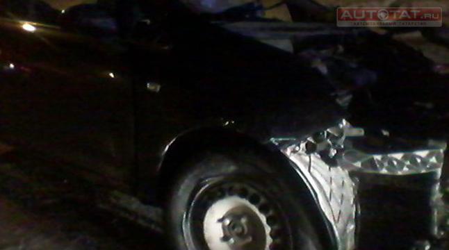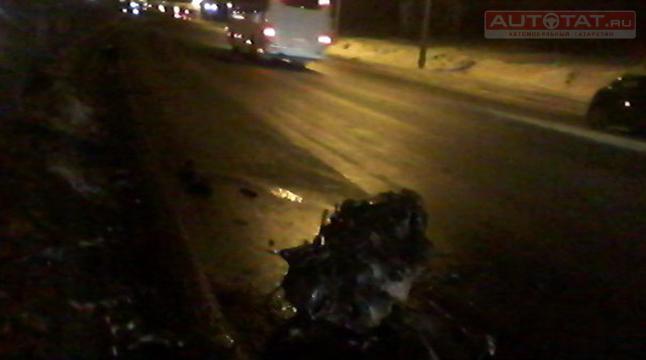 Источник сообщает, что ДТП произошло ночью на Южной трассе. От сильного удара из подкапотного пространства вылетел двигатель и аккумулятор, а также отвалилось переднее колесо.