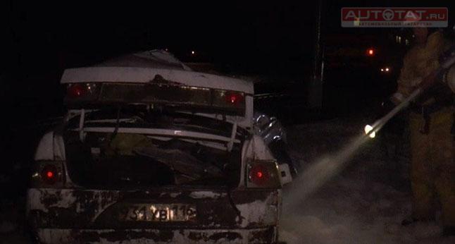 Искореженный ВАЗ-2110 с рельсов убирали пожарные, которые полностью пролили автомобиль, чтобы исключить неожиданного воспламенения.