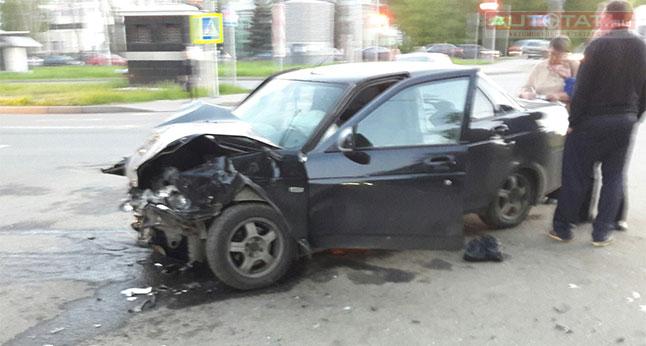 В результате столкновения иномарку выкинуло с дороги прямо на металлическое ограждение, а у “Приоры” серьезно поврежден моторный отсек.