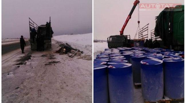 Дорожно-транспортное происшествие случилось на 1024 км автотрассы М-7 9 января. Спасатели прибыли на вызов и выяснили, что фура перевозила химический реактив гидроксиламина, имеющий третий класс опасности. К счастью, все 208 бочек оказались невредимыми, однако для их разгрузки потребовалась спецтехника.