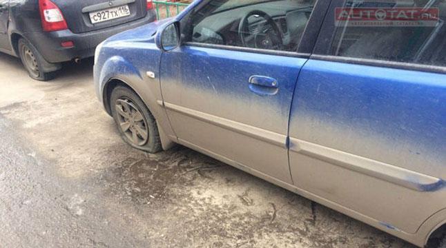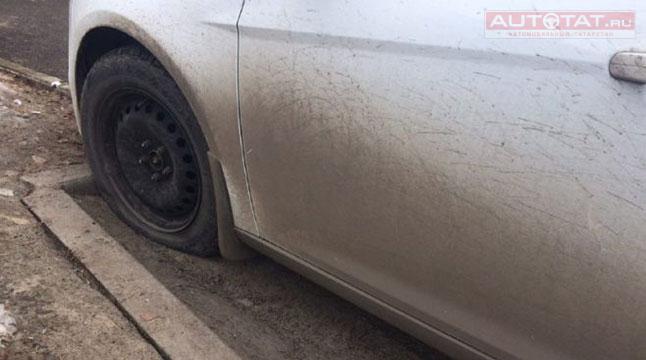 По словам очевидцев, как минимум у пяти автомобилей оказались проткнуты покрышки, еще у нескольких неизвестные украли колпаки.