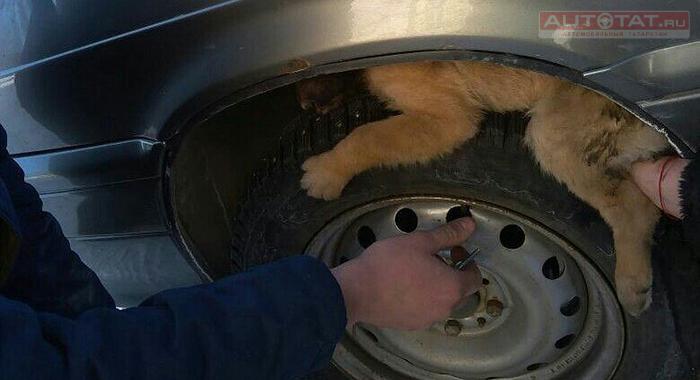 В Нижнекамске случайные очевидцы помогли вытащить щенка, который застрял между колесом и капотом машины. Видимо там он решил погреться. Об этом пишут в соцсетях.