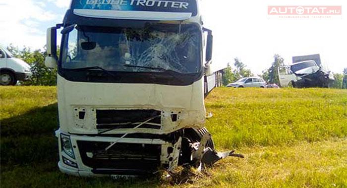 По имеющейся информации, большегруз Volvo из Дагестана протаранил Газель. От удара грузовик выкинуло на встречную полосу движения, где в нее на полном ходу врезался Renault Sandero.