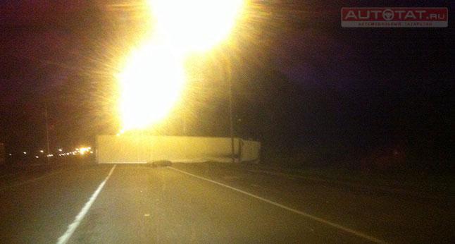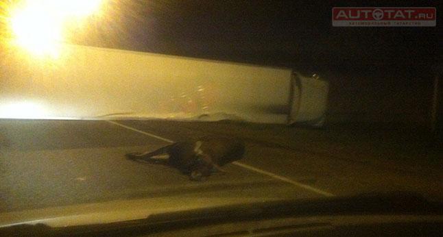 По предварительной информации, водитель тяжелогруза поздно увидел животное и попытался уйти от столкновения, однако фуру занесло и опрокинуло.