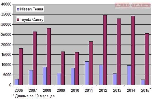 За десять лет своего существования на российском рынке было продано 73 тысяч Nissan Teana, тогда как Camry за это время купили 254 тыс. россиян. Кроме того, детище Nissan по продажам обошли модели Ford Mondeo (94 тыс.) и Mazda6 (112 тыс.).