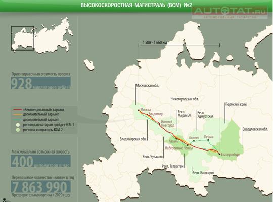 В 2018-ом году в столице Татарстана будет проходить Чемпионат мира по Футболу. И чтобы улучшить сухопутное сообщение между Москвой и Казанью, к чемпионату правительство решило проложить между городами ВМС. Поезда с максимальной скоростью 400 км/ч и средней 200 км/ч смогут сократить время поездки до 3,5 часов.
