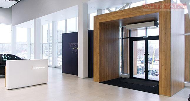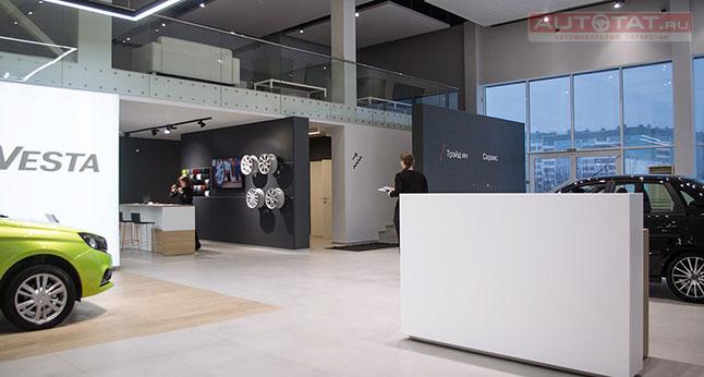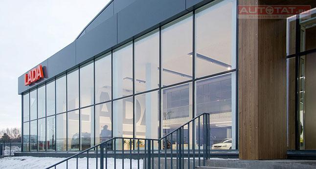 Казанский автосалон получил входную зону в виде портала на главном фасаде здания. Причем напротив него находится площадка с новинками и топовыми моделями АвтоВАЗа.