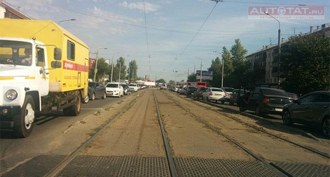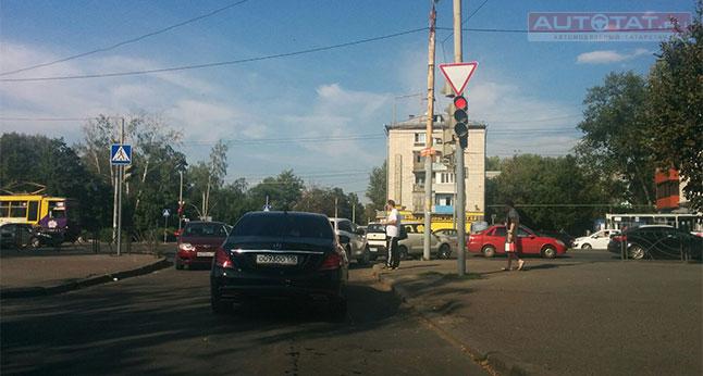 Мне надо было пересечь трамвайные пути и продолжить движение по ул. Академика Королева, однако плотный поток машин, въезжающий на перекресток на запрещающий сигнал светофора, не давал мне завершить маневр.