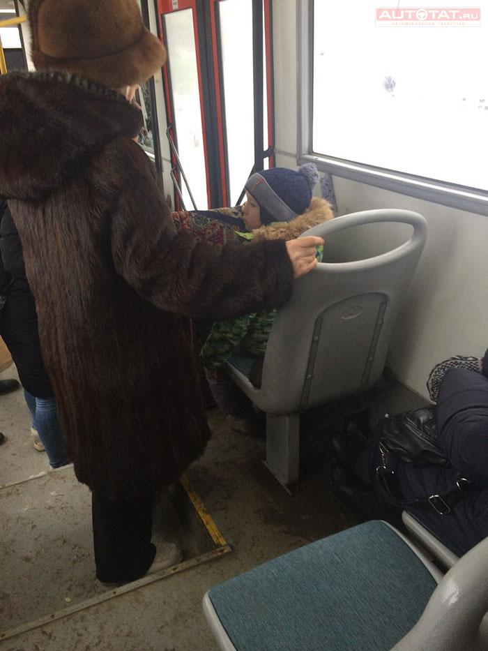 "Некоторые бабушки и мамы деток думают, наверно, что кондуктора общественного транспорта ‘железные’ и могут стоять целый день на ногах! Вот, например,на фото в метре от неё свободное место, а она усадила ребенка на место кондуктора", - жалуются в казанском автобусе.