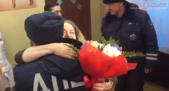 10 февраля вечером к экипажу ГИБДД на ул. Несмелова подбежал водитель и попросил сопроводить их до роддома, у которой начались роды. Стражи правопорядка запросили разрешение и доставили казанцев с мигалками и сиреной до места.