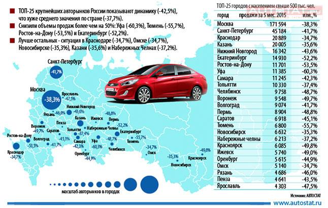 Напомним, что в январе-мае 2015 года многие города России снизили объемы продаж новых автомобилей в связи с нестабильностью курса рубля. Это привело к тому, что крупнейшие авторынки нашей страны за первые пять месяцев текущего года показали динамику (-42.5%) хуже среднего значения по стране (-37.7%).