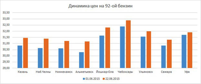 Последние дни июня ознаменовались ростом цен на бензин практически во всех городах Татарстана. Согласно последним данным, средняя цена на АИ-92 на сегодня составляет 31.73 рублей, что на 56 копеек больше, чем в начале текущего месяца.