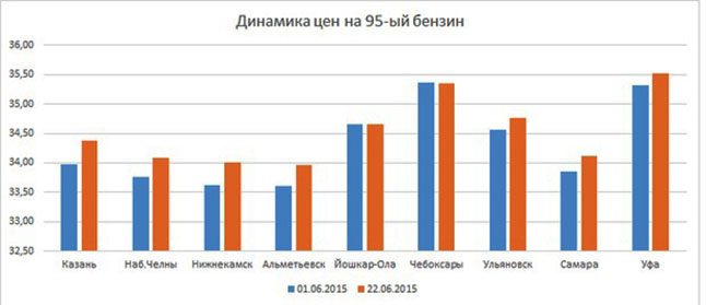Если в начале июня в столице Татарстана 95-й стоил 33.98 рублей, то сейчас некоторые АЗС продают его за 34.38 рублей за литр (по информации Yandex 34.52 рубля).