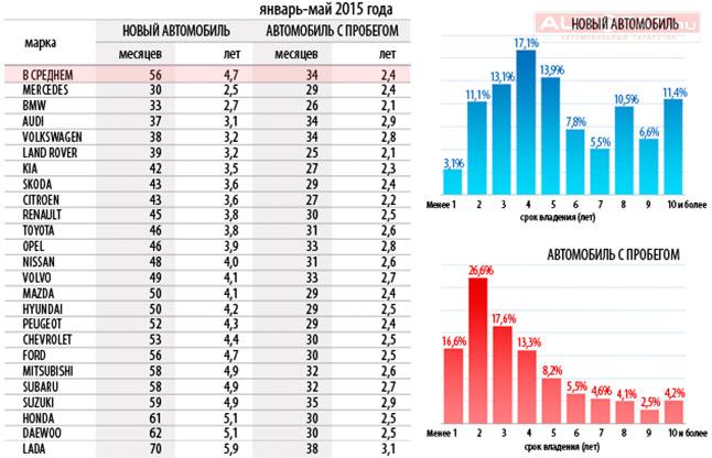 Из массовых брендов дольше всего эксплуатируются модели марок Daewoo, Suzuki, Honda, Subaru и Mitsubishi (4.9-5.1 года). Эксперты также отметили, что в 2015 году чаще всего новые машины меняют по истечении 4-5 лет (31%), а вот 24.1% владельцев предпочитают делать это не позже 2-3 лет. При этом каждый седьмой (14.2%) владелец нового автомобиля ездит на нем не больше двух лет.