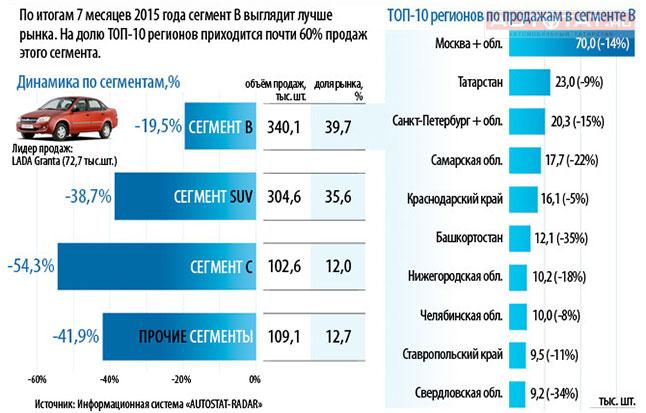 Татарстан вошел в тройку лидеров регионов России по продажам автомобилей в сегменте «В» по итогам первых семи месяцев 2015 года. Республика заняла второе место с показателем в 23 тыс. проданных автомобилей, передает Автосреда.