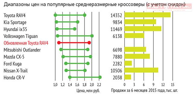 Однако не забывайте про Toyota RAV4. На него скидки сейчас достигают до 170 тыс. рублей. К примеру, базовую комплектацию вседорожника можно купить за 998 тыс. рублей с передним приводом и за 1 316 000 рублей с полным приводом и вариатором. не забывайте, что в пользу Toyota RAV4 идет небольшая потеря в цене на вторичном рынке и более просторный багажник и салон.