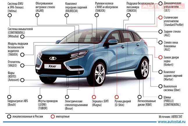 Так, большая часть автокомпонентов производится в России. Помимо кузова АвтоВАЗ делает для XRAY двигатели, коробки передач, подрамники передней подвески, панель приборов, бампера, радиаторную решетку и рычаги подвески.