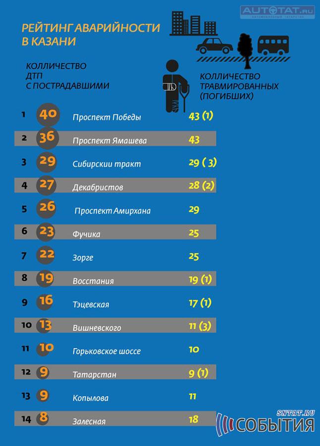 Обратите внимание, что больше всего ДТП произошло в минувшем году на ул. Пр. Победы (43 аварии), в результате которых один человек погиб. Предлагаем вашему вниманию рейтинг аварийности дорог в Казани: