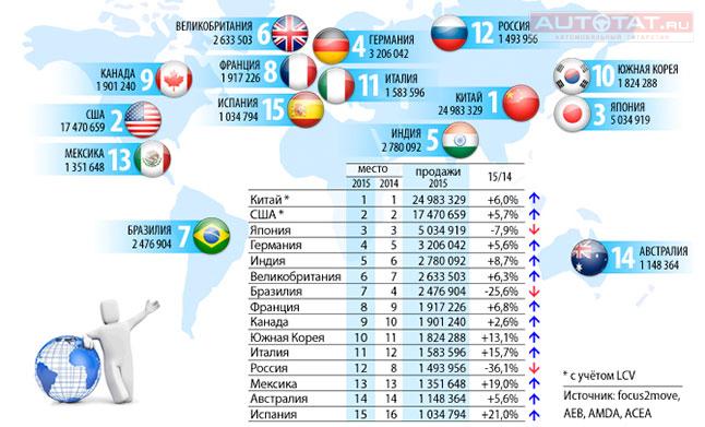 Отметим, что по итогам минувшего года почти все авторынки, попавшие в ТОП-15, показали положительную динамику продаж. Исключение лишь составили Япония (-7.9%), Бразилия (-25.6%) и Россия (-35.7%).