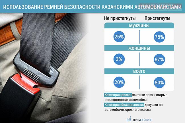 Кстати, чаще всего не пристегиваются ремнями безопасности мужчины. В среднем по Казани на 100 машин, управляемых девушками, приходится лишь 3 нарушительницы ПДД. Получается, что 97% женщин-водителей активно используют ремни безопасности.