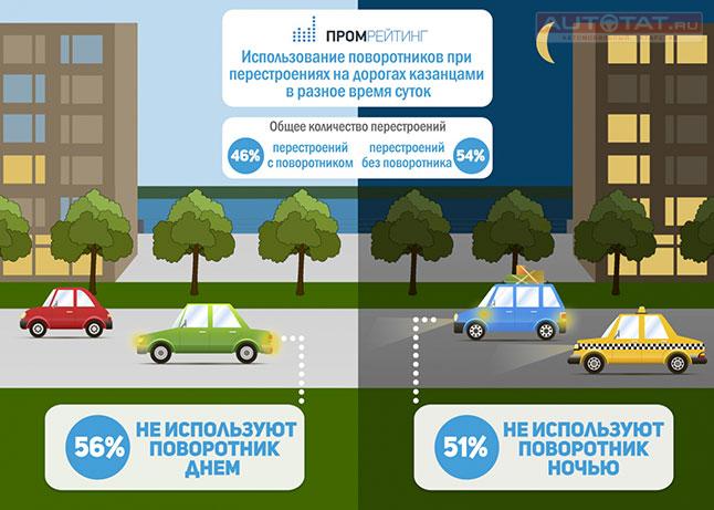 При этом, в светлое время суток водители Казани не пользуются поворотниками чаще, чем ночью. К примеру, днем автолюбители не оповещают других участников дорожного движения о намерении совершить маневр в 56 случаях из ста. Ночью же эта цифра снижается до 51 случаев.