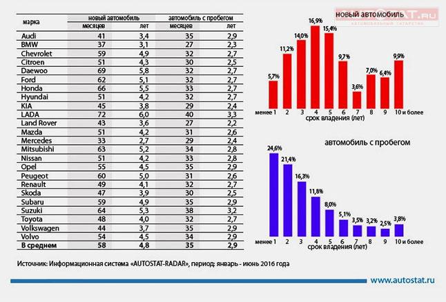 Согласно последним исследованиям аналитического агентства “Автостат”, срок владения новым авто в России по итогам первой половины 2016 года составил 58 месяцев, а подержанным - 35.