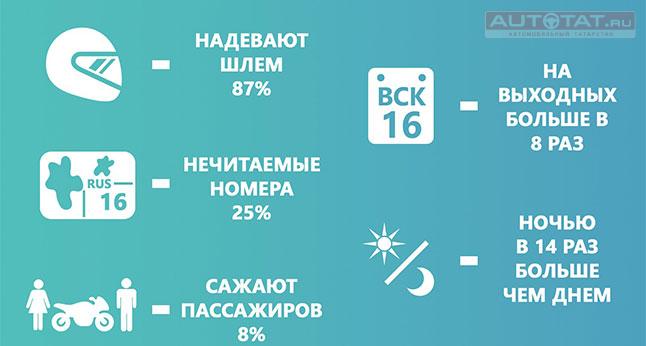 Отметим, что в сводках ГИБДД проблема незащищенных голов байкеров фигурирует весьма часто. Обычно без шлемов катаются деревенские ребята на недорогих отечественных мотоциклах. А вот подавляющее большинство казанских байкеров (87%) предпочитают заботиться о своей безопасности.
