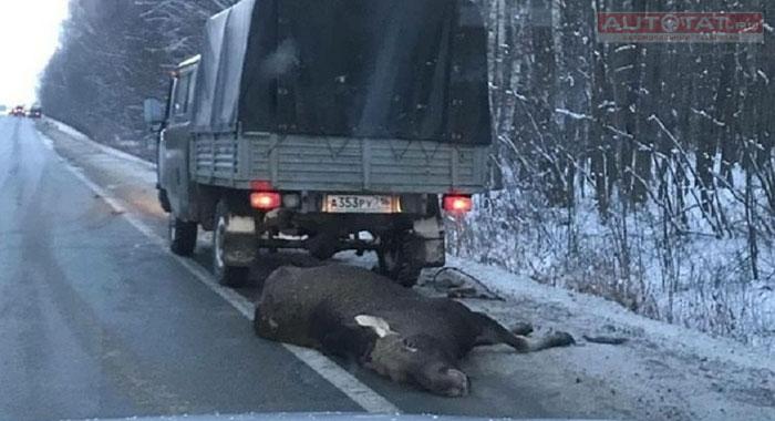 Судя по повреждениям на кузове “Лады”, лось подлетел и повредил не только переднюю часть кузова, но и крышу легковушку. От полученных травм животное скончалось на месте происшествия.