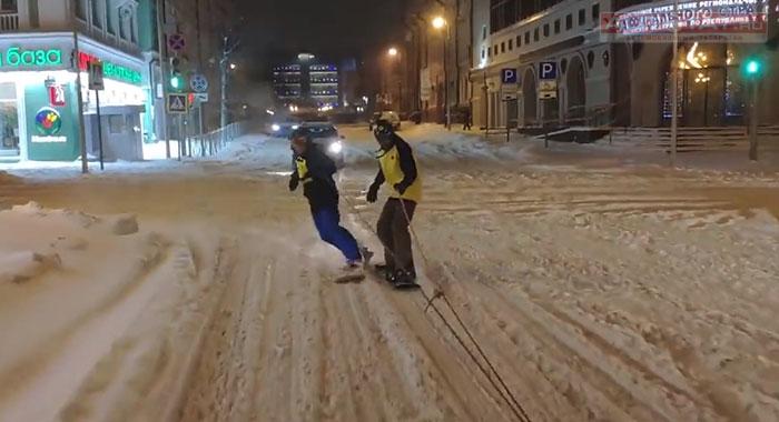 На нем видно, как двое молодых людей в горнолыжных костюмах катаются по заснеженной Казани под стенами Кремля и по дорогам общественного пользования.