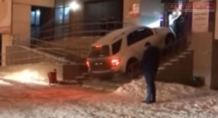 На записи видно, что белый внедорожник Mercedes зачем-то пытается забраться по лестнице в бар. инцидент случился утром 13 января. Причем на крыльце в этот момент находились люди.