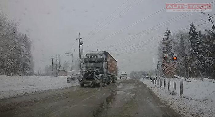 На записи видно, как частично на рельсах стоит большегруз и в него на полном ходу влетает автобус. Только чудом автор ролика не попал под “замес” с двумя грузовиками.
