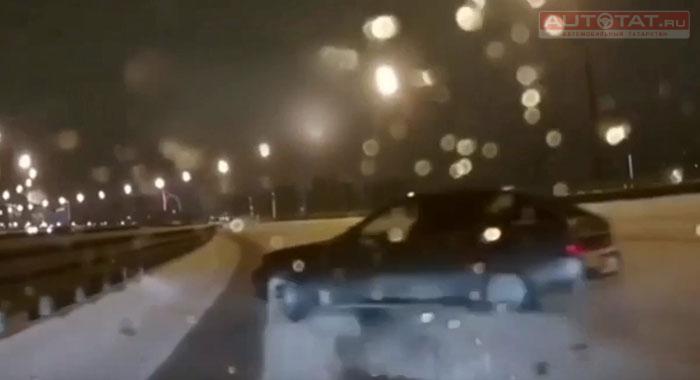 Минувшей ночью на мосту Миллениум неизвестный владелец легковушки не выбрал безопасную скорость и врезался в металлическое ограждение. Момент ДТП попал на видеорегистратор казанца.