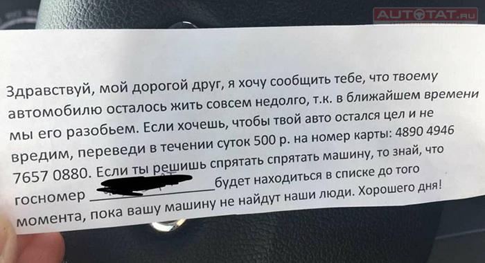 - Я хочу сообщить тебе, что твоему автомобилю осталось жить совсем недолго, т. к. в ближайшем времени мы его разобьем. Если хочешь, чтобы твой авто остался цел и не вредим, переведи в течении суток 500 р. на номер карты (далее следует номер — прим. ред.). Если ты решишь спрятать спрятать машину, то знай, что госномер (вписан номер автомобиля — прим. ред.) будет находиться в списке до того момента, пока вашу машину не найдут наши люди. Хорошего дня!