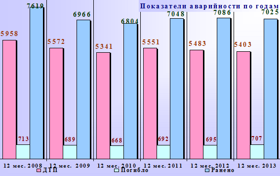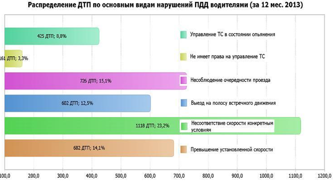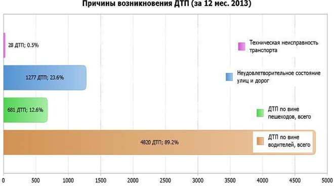 Главной причиной возникновения аварий оказались сами водители, а вот по вине пешеходов в 2013 году произошло 12.6% ДТП от общего их числа.