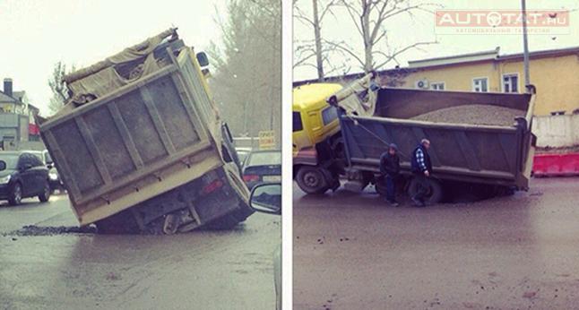 Сегодня, 29 октября, в социальных сетях появились фотографии провалившегося под асфальт КамАЗа в Казани. Необычное ДТП произошло на ул. Даурская буквально пару часов назад.
