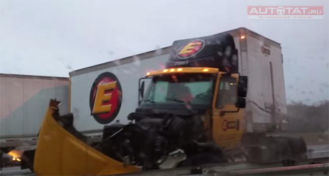 В Интернете появился ролик, на котором водитель грузовика потерял управление на заледенелой дороге, пробивает отбойник и вылетает на встречную полосу. Оператор явно родился в рубашке!