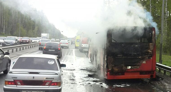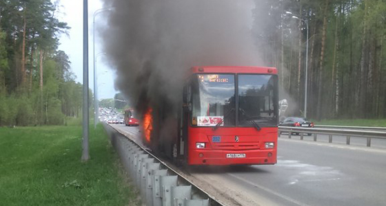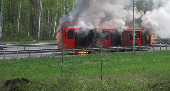 Сегодня утром в Казани на Горьковском шоссе загорелся красный автобус, следовавший по маршруту №72. В Интернете появились фотографии с место происшествия.