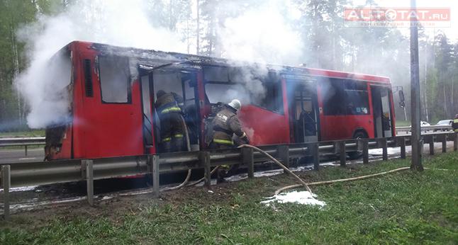В Казани на Горьковском шоссе загорелся красный автобус