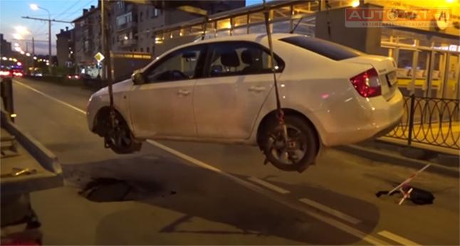 В Казани Skoda Rapid провалилась в асфальт возле станции м.Яшьлек