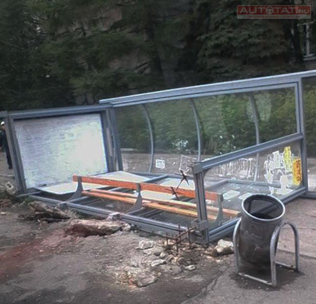 В Казани красный автобус снес остановку бампером. ФОТО.