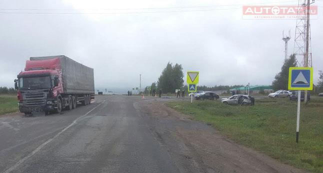 Трагедия случилась в 9:45 часов. По предварительной информации, водитель автомобиля «Скания» 1963 года рождения на перекрестке равнозначных дорог во время движения по второстепенной дороге нарушил п. 13.9 ПДД и не пропустил автомобиль LADA Kalina под управлением водителя 1968 г.р., двигавшегося со стороны села Чупаево на Альметьевск.