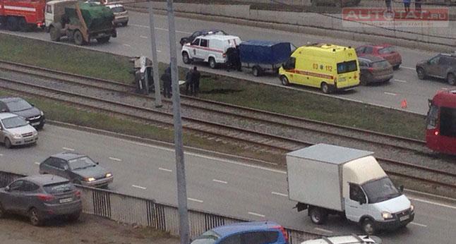 По словам водителя автомобиля LADA его попросту зажал грузовик, и он вылетел на трамвайные пути. К счастью, в ДТП пострадала лишь легковушка и Метроэлектротранс, ведь из-за лежащего на путях автомобиля трамваи встали почти на час.