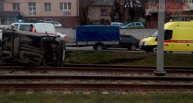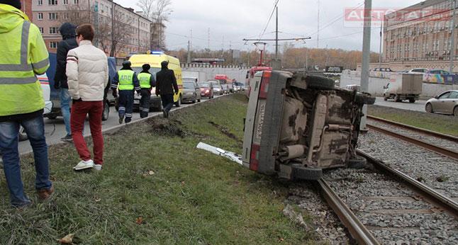 Сегодня утром неподалеку от перекрестка улиц Арбузова и Журналистов произошло серьезное ДТП, в результате которого “Лада” 9-й модели перевернулась и оказалась на трамвайных путях.