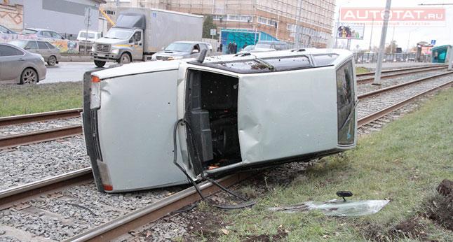 В Казани "девятка" вылетела на трамвайные пути и перевернулась