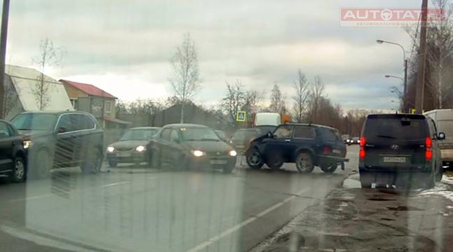 Судя по всему, женщина-водитель не справилась с габаритами своего автомобиля и ударила передом сначала BMW, а затем отскочила задом на LADA 4x4, который двигался во встречном направлении.