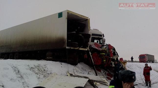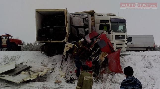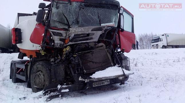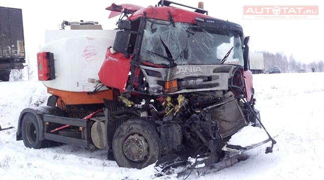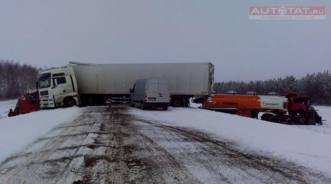В Актанышском районе Татарстана произошло серьезное ДТП: в результате столкновения двух фур, бензовоза и микроавтобуса погиб один человек.