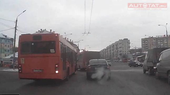 Инцидент случился недалеко от Московского рынка в Казани, где водитель красного автобуса видимо решил объехать затор или проскочить побыстрее перекресток на зеленый сигнал светофора и выехал на встречную полосу движения.